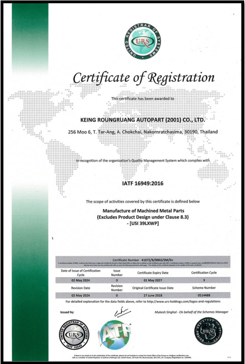 At Keing Rungruang Autoparts, we pride ourselves on maintaining the highest standards of quality and reliability in our manufacturing processes. Our dedication to excellence is reflected in the certifications we have achieved, including: